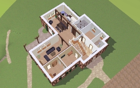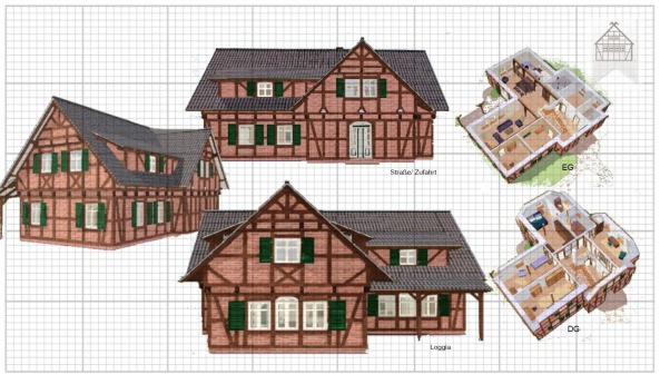 Dekorative Details Fachwerk: Schubbänder, Andreaskreuze, Stichbögen über Terrassentüren und Hauseingangstür, Klappläden