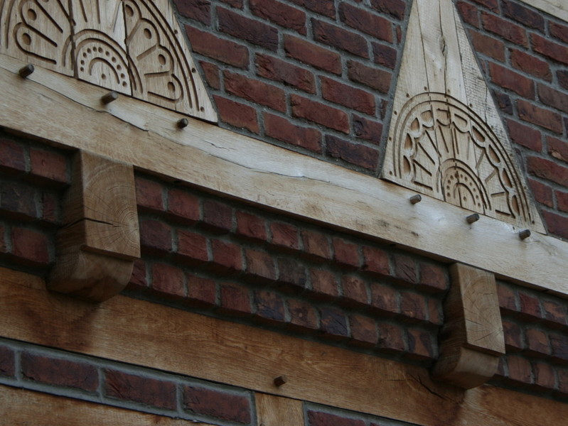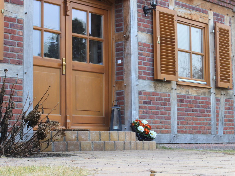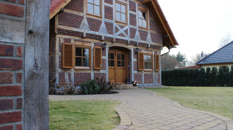 Vier-Giebel-Haus, Fachwerk original verzapft (Eichenfachwerk/ hinterlüftetes Fachwerk, zweischaliges Mauerwerk)/ Fachwerk, detailreich mit vielen dekorativen Elementen, ausgefacht mit Wienerberger Vormauerziegel/ individuell gefertigte Landhaustür als Hauseingangstür, zurückgesetzt/ Terrassentüren und Hauseingangstür- je mit Oberlicht (Stichbögen)/ Echtholz- Sprossenfenster und Holz- Fensterbänke/ Klappläden vor Fenstern und Terrassentüren (EG)/ sichtbare Holzbalkendecken, dekorative Holzstützen mit Kopfbändern/ Raumhöhe bis Oberkante Balken ca. 280 mm, Balkenlage/ 2-flüglige Terrassentüren mit Stichbögen/ Innenwände aus Poroton und Kalksandstein/ dekorativer Sichtstrukturputz Innen/KAMIN/Landhaustüren/ eingestemmte Wangentreppen bis hoch zum Studio im Spitzboden/Spitzboden ausgebaut mit verglasten Studiogiebeln, Rundbogenfenster/ Gäste – WC mit Dusche/großes Dusch- und Wannenbad mit SAUNA u.v.m. ....GARAGE im Fachwerkstil mit klassischen Klaspentor und Nebeneingangstür u.v.m.